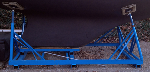 | The three round tubes under the keel used to support the boat but where a couple of inched from the ground and were bending under the weight which caused the boat to be over a foot down in the bow and not level. I purchased 4x4 steel square tube and 8 inch C channel and welded it under the cradle. the keel now sit on the C channel which sits on the 4x4 tube that now sits on the ground supporting the boat in a level stance. ( it was under $300 for all the steel cut to my measurements and $70. for the rental of the welder for the day.) and a can of Tremclad paint. | ![]() |