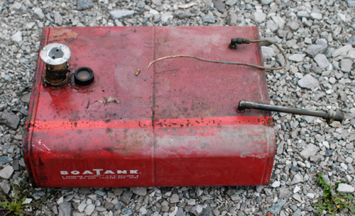 When ever I opened the boat up we noticed the smell of gas in the cabin. It wasn't until I took the engine out that I had access to the fuel tank. The vent hose had hardened and broken off just behind the clamp. The tank was venting into the cabin through the broken hose. I did not like the location of the fuel filler on the sole of the cockpit where dirt and water could and would go into the tank every time you opened it to fill it. the tank was starting to rust so I decided to remove it and all the current and potential problems with it. I temporarily plumbed in a 2.5 gal plastic outboard tank with a new hose and rubber squeeze ball. It has worked out so well that I am going to go to a 5 gallon tank and vent it properly so I can move it from the cockpit into the lazarette. |