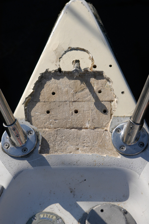 Under the plate the balsa core was all wet and starting to rot so that had to be removed. It was then filled with epoxy with micro balloons, sanded and painted before the plate was re-attached. |