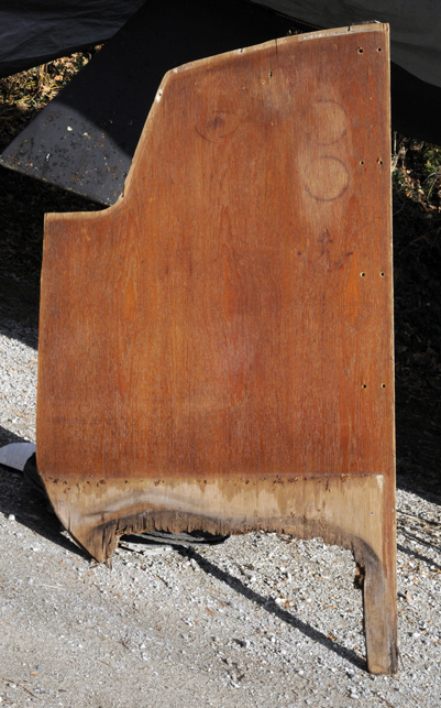 inch mahogany glued to both sides of 1/2 inch plywood. A new piece of 3/4 mahogany plywood was cut to replace the original and bolted into place. |