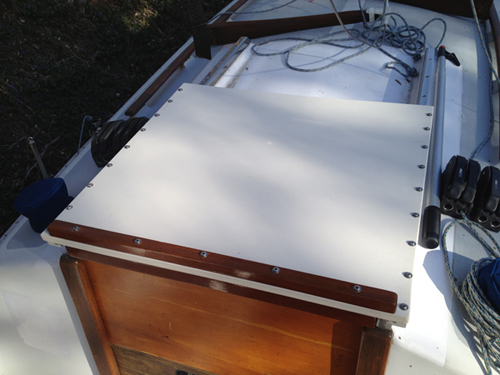 | The upper picture shows the plywood prototype. the plywood was encapsulated in epoxy resin although with contraction and expansion of the wood cracks formed in the paint and water got under the paint and lifted it, It peeled off. This hatch is 3/4 inch Starboard so no paint, more stable, waterproof and strong. Hatch is shown with teak trim. Stainless splash guard still to be added when I get it made for along the front edge. |